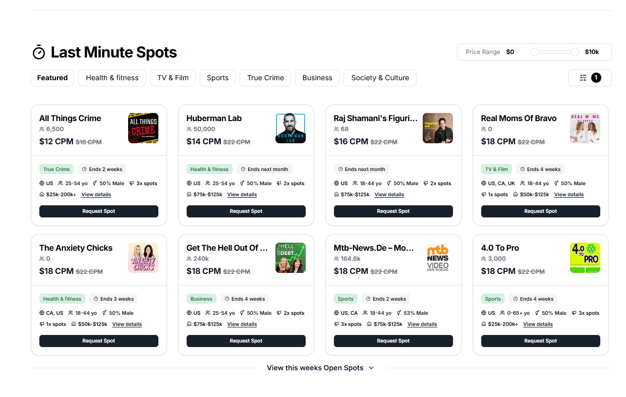 Spotsnow makes it easy for brands and advertisers to discover last-minute host-read advertising opportunities in one place.
